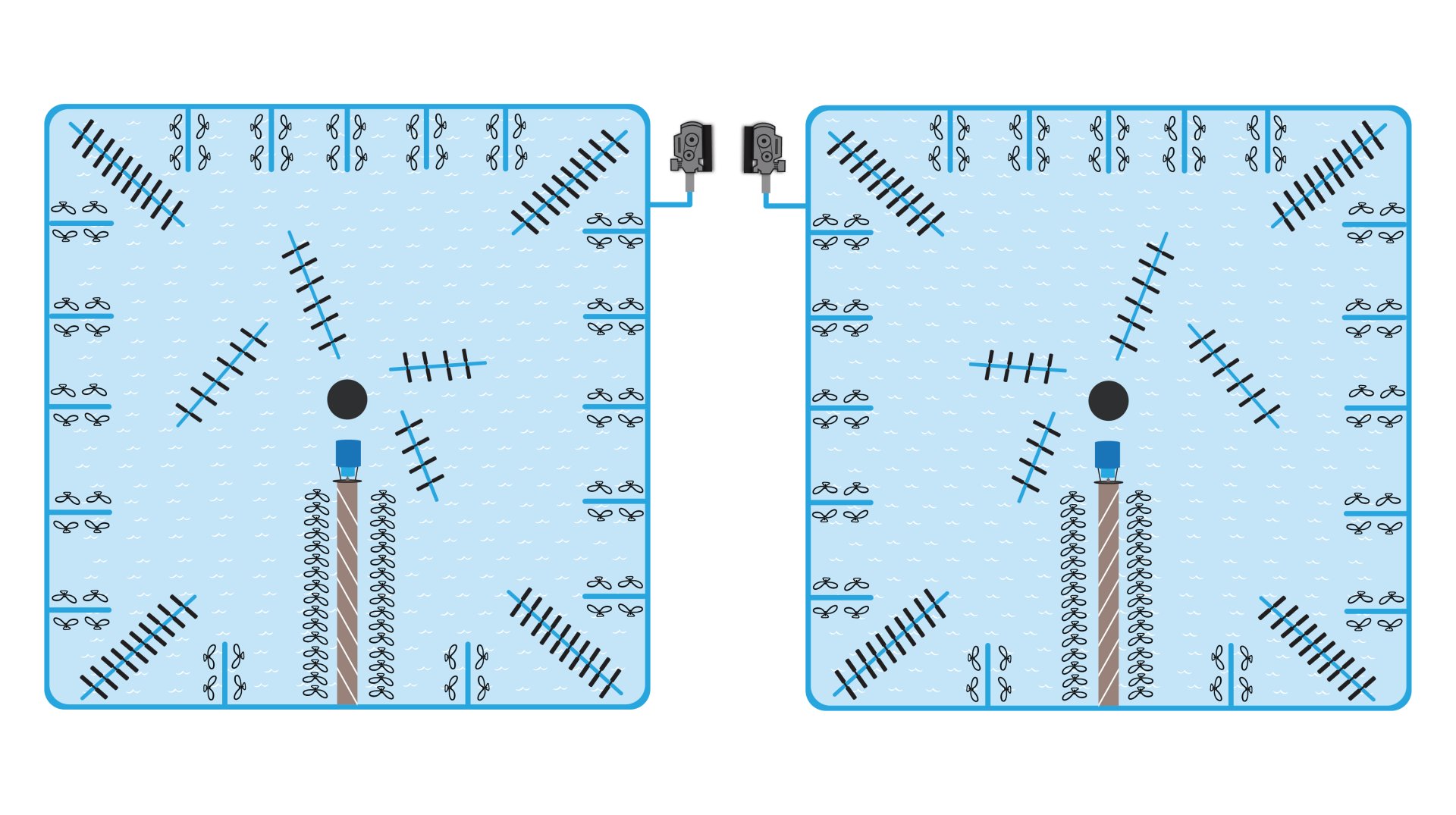 ตัวสายยางเติมอากาศโอทูบับเบิ้ลที่ทำเป็นดอกไม้ใช้วางรอบบ่อ และแนวให้อาหารทั้งหมด 140 หัว ใช้ปั๊มรูทโบลเวอร์ 3 นิ้ว มอเตอร์ 7.5 แรง 1 ตัว มีท่อพัดลมขนาดประมาณ 10 นิ้ว ยาวประมาณ 2 เมตร เพื่อให้ปั๊มลมทำงานได้สบายยิ่งขึ้นเดินท่อเมนหลักรอบบ่อขนาด 3 นิ้ว แล้วแยกท่อขนาด 2 นิ้วออกมาเพื่อใส่วาล์วคุมลมที่หัวออกซิเจน