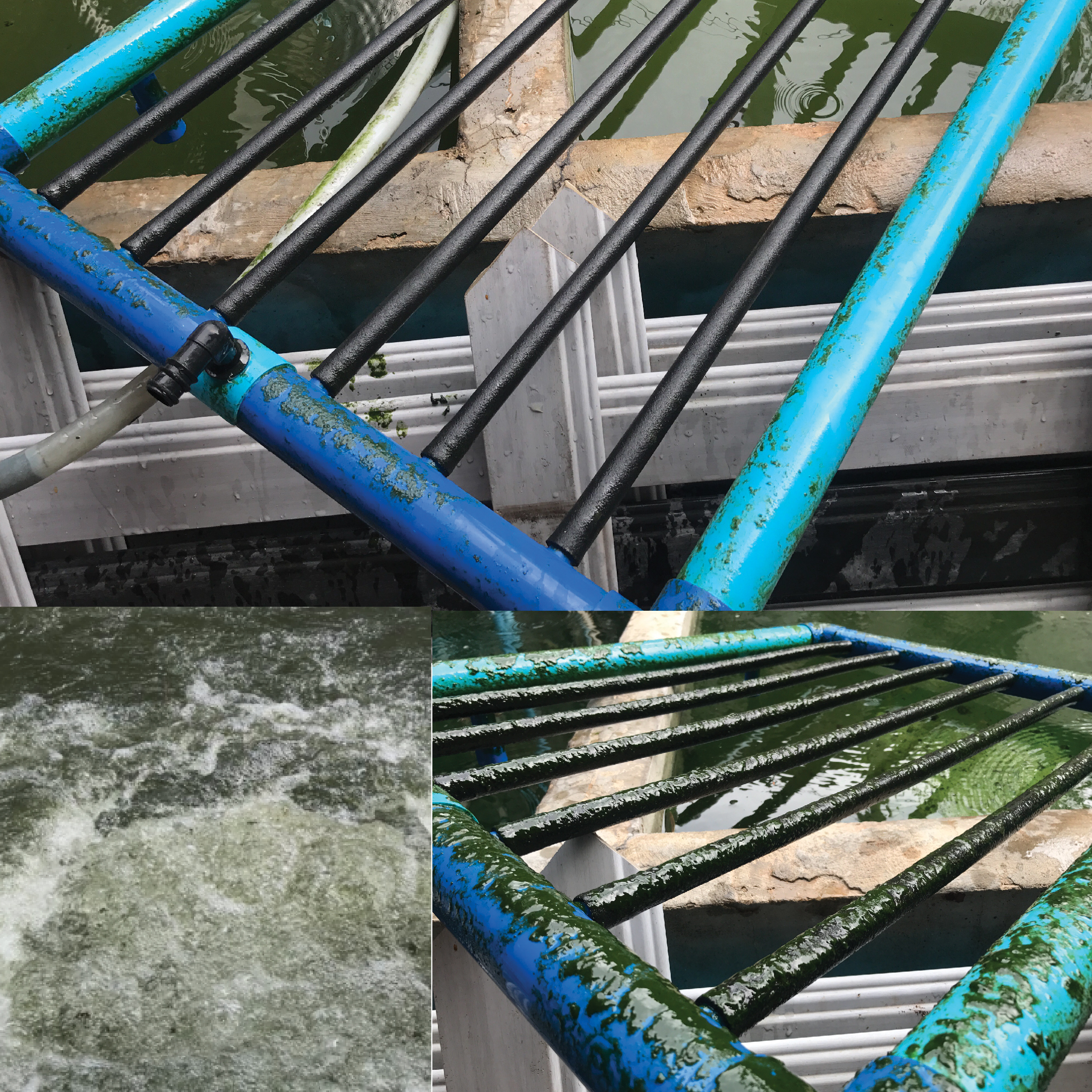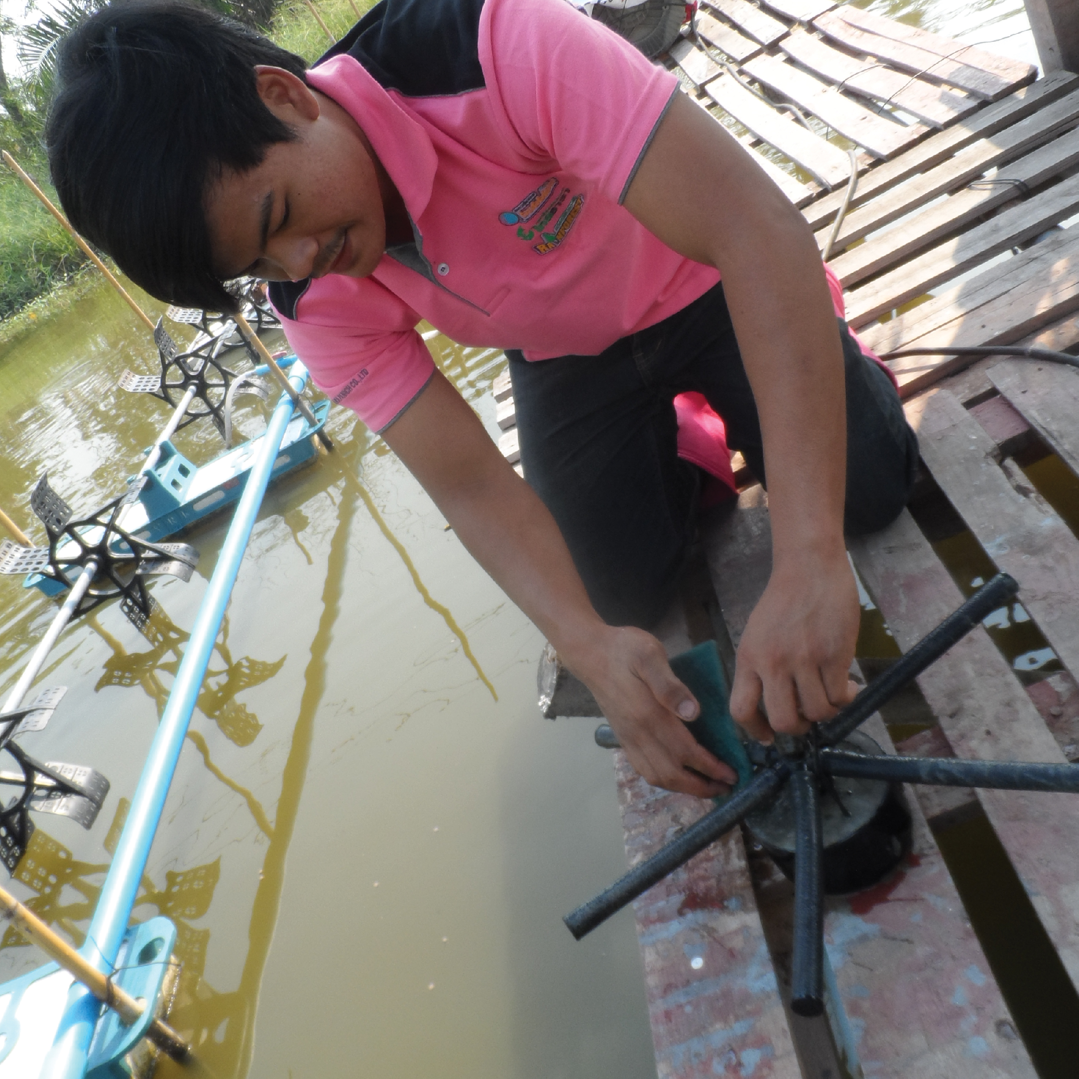 การเพิรจ์(Purge) การใช้แรงดันสูงเพื่อดันตะกอนให้หลุดจากสาย ปิดวาล์วควบคุมอุปกรณ์เติมอากาศลง ให้จำนวน 15-25% ของที่ติดตั้งต่อปั้ม แล้วใช้แรงดันลมผลักตะกอนออกจากอุปกรณ์ส่วนที่วาล์วยังเปิดอยู่ สามารถทำการเพิรจ์ระหว่างการเลี้ยง อาทิตย์ละครั้ง หรือทุกๆ 2-3 วัน จะยืดอายุการใช้ในครอปดีขึ้น รวมทั้งสามารถทำหลังจบครอป แล้วจึงนำไปล้างทำความสะอาดต่อไป