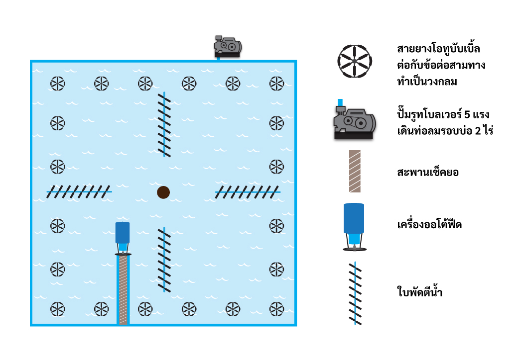 - ใช้สายยางโอทูบับเบิ้ลต่อกับข้อต่อสามทางทำเป็นวงกลม รอบบ่อ 20 หัว/บ่อ